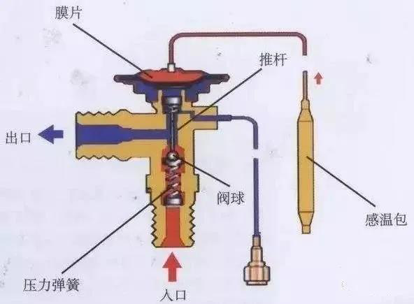起節(jié)流降壓的作用,經(jīng)冷凝器冷凝后的高壓制冷劑液體經(jīng)過(guò)節(jié)流閥時(shí),因受阻而使壓力下降,導(dǎo)致部分制冷劑液體汽化,同時(shí)吸收氣化潛熱,其本身溫度也相應(yīng)降低,最為低溫低壓的濕蒸汽,然后進(jìn)入蒸發(fā)器。