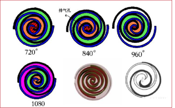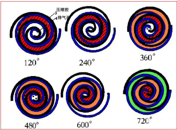在壓縮過(guò)程中,渦旋定子(靜盤(pán))保持固定,而渦旋轉(zhuǎn)子(動(dòng)盤(pán))則每隔90°順時(shí)針圓周運(yùn)動(dòng),氣腔內(nèi)的氣體即被壓縮成高壓氣體,并經(jīng)渦旋中間的排氣口排出。