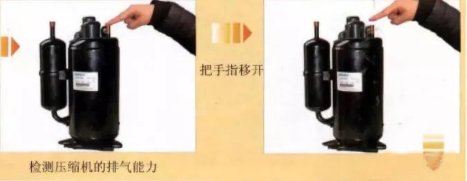 首先,將壓縮機卸下, 加電使其運轉,用手指堵住壓縮機的排氣孔片刻, 再將手指移開。 由于壓縮機內有壓力, 所以當用手堵住壓縮機的排氣孔時, 應感到有排氣壓力;當把手指移開時, 可以聽到 “呲呲的排氣聲, 而且排氣壓力正常的壓縮機,應很難堵住壓縮機排除的氣體,這表明壓縮機性能良好。如果用手堵住排氣管時感覺不到壓力, 將手指移開時,聽不到排氣聲, 則說明該壓縮機性能不良。如下圖所示: