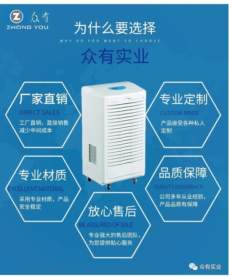 工業除濕機也分很多種,有壁掛式的、吊頂式的、新風式的……一般企業需要根據自身的使用環境,以及使用需求,來明確應該選擇什么樣的除濕機。例如對環境干燥程度較高的產品,并且工廠有臺階設計的,可以選擇大滾輪扶手式的工業除濕機,除濕更方便。眾有工業除濕機,擁有25cm特大滾輪扶手,可以輕松翻越臺階,配置進口LG品牌壓縮機,幫助工廠急速除濕。