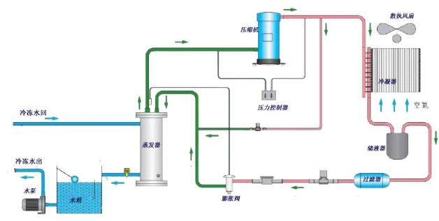 當(dāng)空氣冷卻式制冷機(jī)啟動時,制冷劑吸收蒸發(fā)器中被冷卻物體的熱量并蒸發(fā)。壓縮機(jī)不斷地從蒸發(fā)器中提取產(chǎn)生的氣體,并將其壓縮成高溫高壓蒸汽。然后,制冷劑蒸汽被送往冷凝器,在那里與空氣進(jìn)行熱交換。釋放熱量后,它凝結(jié)成液體。液體制冷劑在被膨脹閥減壓后,進(jìn)入蒸發(fā)器,在那里再次蒸發(fā),吸收冷卻物體的熱量。重復(fù)該熱交換過程,直到工業(yè)用水冷卻到所需溫度。