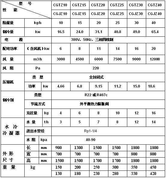 水冷調溫型管道除濕機技術指標: