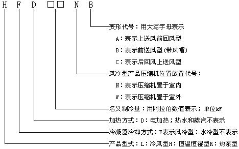 型號舉例:HF19N 表示名義制冷量為19kW的壓縮機置于室內(nèi)的風(fēng)冷型單元式空調(diào)機組。